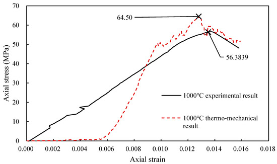 Comparison of experimental and predicted stress–strain relationships for rocks subjected to heat treatment at 1000 °C.
