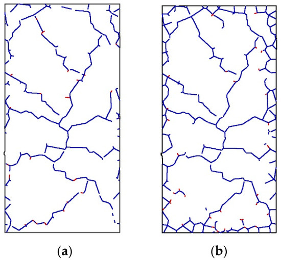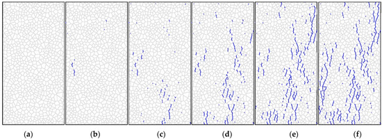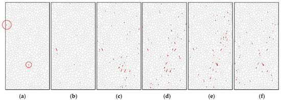 Figure 9 and Figure 10 show the model predictions for the development of shear cracks and tensile cracks during unconfined uniaxial compression loading. Figure 9a–c and Figure 10a–c correspond to the stage before the UCS has been reached, while Figure 9d and Figure 10d correspond to the sample reaching the UCS. Figure 9e,f and Figure 10e,f show the crack distribution after failure. Only tensile cracks occur during crack initiation, according to Nicksiar and Martin (2014), who employed UDEC-GBM with unbreakable grains to model hard crystalline rocks [23]. However, Figure 9a shows that the initial cracks predicted by this model are shear cracks, indicated by the red circle.