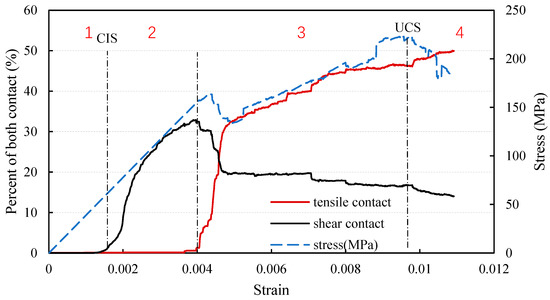 Although UDEC provides its own embedded criterion, users can create their Fish function to determine contact failure types. Based on the judging criterion contained in UDEC, a modified criterion, see Equation (2), was developed and a Fish function was written to extract information about shear and tensile contact failures. However, to verify whether the initial cracking which occurs during the uniaxial compression of granite is due to shear or tensile loading, additional numerical simulations may be required. With the criterion established in this paper, shear cracks rather than tensile cracks appear first. Furthermore, it was found that heat treatment affects the development of shear cracks and tensile cracks, and the transition of shear cracks to tensile cracks.
