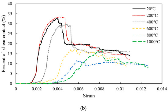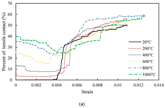 To investigate the effect of heat treatment on the development of shear cracks and tensile cracks, the percentage of tensile contacts as a function of strain during uniaxial compression testing after heat treatment at different temperatures is shown in Figure 13a. The initial number of tensile cracks increases with the temperature of the modelled thermal cycle, with the highest value of 40% occurring after heat treatment at 1000 °C. It is a thermal expansion which causes the observed increase in the initial number of tensile contacts. At the beginning of the uniaxial compression test, the number of tensile cracks decreases in the specimens which have been exposed to high temperatures. Some of the tensile contacts close and then open again as the specimen enters the unstable fracture development stage. Examination of Figure 8 shows that the tensile contacts normal to the direction of the applied load close much more easily than the tensile contacts in line with the direction of the applied load during initial loading. Compared with the 20 to 400 °C curves, the curves corresponding to 600 to 1000 °C reach the unstable fracture development stage at a lower strain.