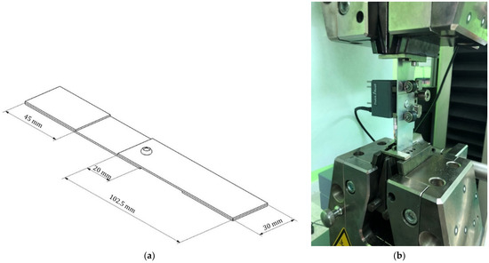 The object tested in the presented work was a single-lap joint with a blind rivet. The geometry of the riveted joint was shown in Figure 1a. Dimensions were taken from standard ISO 12996 []. The sheets were made of EN AW 2017A aluminum alloy with a thickness of 1 mm and the blind rivets were made of EN AW 5251 aluminum alloy with a diameter of 4 mm. According to the standard [], additional plates should be glued to the ends of the joined sheets to ensure the axial nature of the load (as seen in Figure 1a). The mechanical properties of the sheet material and the blind rivet material were given in Table 1.