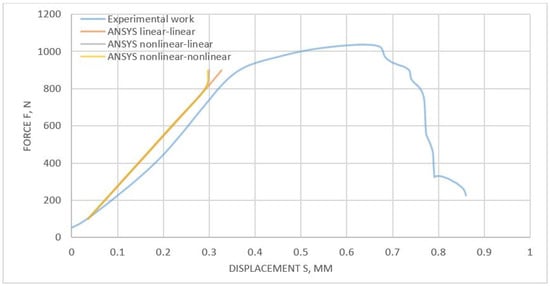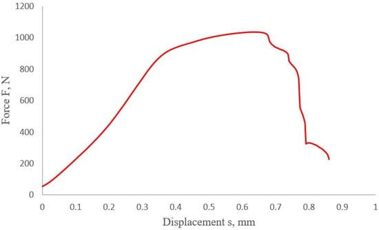 As a result of the load capacity test (tensile test), the maximum value of the transmitted force was determined at the level of 1036 N (with an elongation of 0.635 mm) (Figure 2). Breaking of the joint was achieved with the traverse path value of s = 0.856 mm. Based on the ISO 12996 [] standard, taking into account the safety factor, the force in the connection was assumed to be 0.3Fmax, where Fmax was the maximum force transferred by the connection (1036 N). Hence, 0.3Fmax = 311 N.
