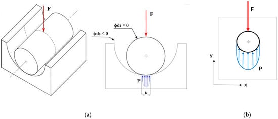 The width of the contact surface for a cylinder–cup contact (parameter b) was defined by Equation (3). The equation for the width of the joint depends on the force, the contact length (L = 1 mm), and the relative diameter of the joint (), as well as the relative Young’s Modulus (). Theorem-type environments (including propositions, lemmas, corollaries, etc.) can be formatted as follows: