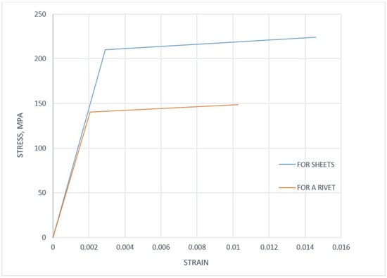 Models of elasto-plastic materials were considered. The true stress–strain curves of the bilinear material model for a sheet and a blind rivet were shown in Figure 4. The data on material properties used to define the material models are presented in Table 3.