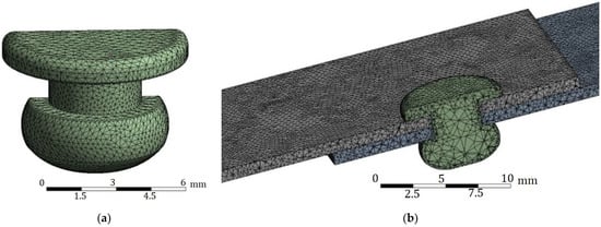 The geometrical (discrete) model consists of three solids: a blind rivet and two sheets, whereas the FE mesh contains more than 900,000 elements (tetrahedral elements with 10 nodes) with a quadratic square function (Figure 5b). Figure 5a shows the mesh of the rivet (after the riveting process—not conducted during the numerical tests presented in this document). To obtain more accurate results in the area of the rivet (more precisely, the rivet mandrel), additional compaction of the elements was assumed on the contact surfaces. The size of the elements and their density was selected through a series of numerical analyses aimed at obtaining the convergence of the results.