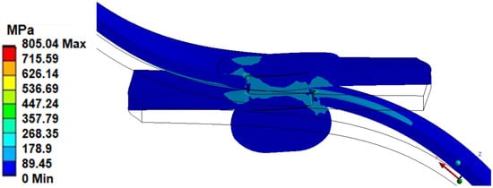 In the case of numerical tests carried out for a riveted joint loaded with an axial force of 900 N, the highest value of equivalent stresses was obtained for the edge of the sheet in contact with the rivet shank (value 805 MPa—linear elastic model). Stress concentration was observed around the site of occurrence (Figure 6). An additional stress concentration, following the load diagram, was observed in the area of the plates’ pressure on both ends of the rivet (this results from the gentle rotation of the plates due to the elimination of clearances).