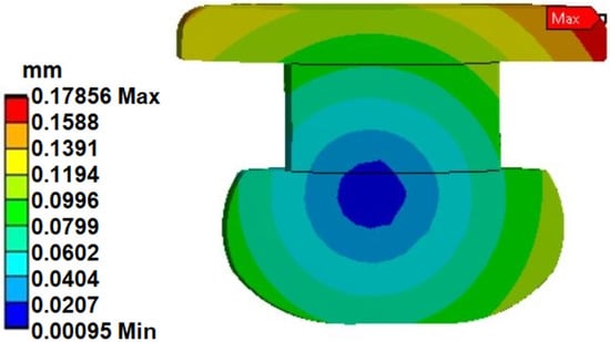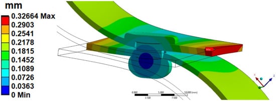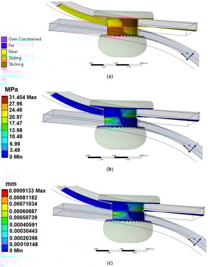 The last but not least important result obtained in the “Contact Tool” was information on the level of mutual interference/penetration between the cooperating bodies. The maximum penetration (Figure 10c) was observed at the same location where the highest values of contact/pressure stresses were detected.