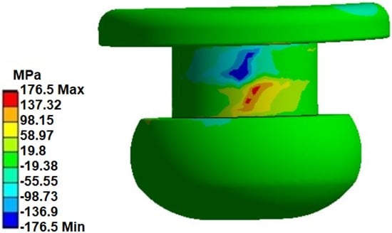 Moving on to the analysis of the stress state in the rivet itself (in the case of F = 900 N, linear models), the values of the shear stresses in the XY plane should be discussed (Figure 9). the maximum value of shear stresses was 176 MPa, while the lowest was −176 MPa. These values appear on the sides of the rivet (they were the result of the pressure of the walls of the change in the shape of the hole in the plate).