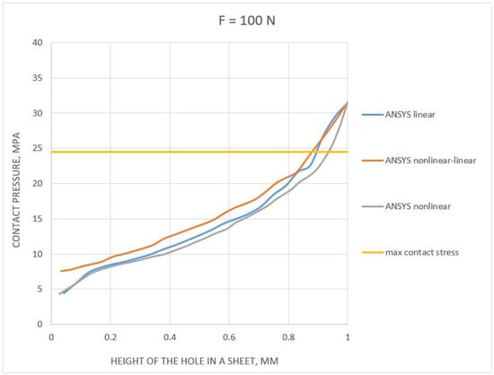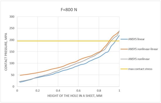 The next step in evaluating the results of the numerical tensile analysis of the unilateral rivet joint was to determine the contact stresses along with the height of the rivet shank (from 0 to 1 mm, where 0 corresponds to the location at the edge of the rivet and 1 mm corresponds to the center of the rivet, which was half its height). The distributions obtained for all configurations of material models, including the calculated contact stresses, were presented in Figure 11 and Figure 12 (for the forces 100 and 800 N, respectively).
