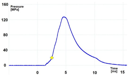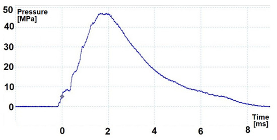 In order to give the mortar projectile an initial velocity that would provide the required distance, appropriate propelling charges shall be used. These charges during the shot burn create a high pressure of gunpowder gases that affect both the projectile and the bottom of the barrel. Although the mass of the propelling charge is variable (depending on the required distance of the projectile), in this article the work of the mortar on the full propelling charge will be described, ensuring both the highest velocity of the projectile and the highest pressure of gunpowder gases inside the tube [12]. Figure 2 and Figure 3 show the pressure p(t) diagrams inside the 60 mm and 98 mm mortar barrel tube during firing (which were obtained during verification tests of mortars conducted in the Military Institute of Armament Technology).