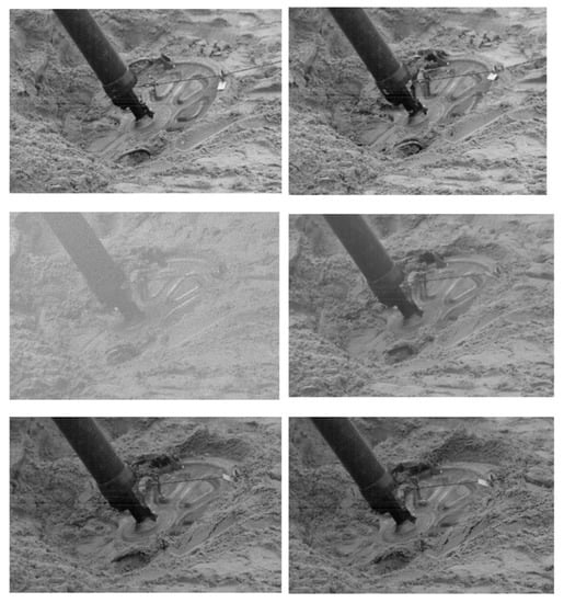 To brake the barrel of the mortar and ensure its stability during the shot, a base plate is used, which transmits the recoil force to the ground. Due to the much larger diameter of the base plate in relation to the diameter of the barrel, the pressures with which the base plate can affect the ground are much smaller. Nevertheless, for a 60 mm mortar, the maximum pressure with which the base plate can affect the ground is 1.57 MPa. In the case of a 98 mm mortar, it is 1.9 MPa. In most cases, the shooting is carried out by the mortar adapted to the deformable substrate and it will delve into the ground together with the base plate during the shot. Figure 4 shows a sequence of frames from a movie, recorded with a high speed camera during a mortar shot, showing the sinking of the base plate into the sandy soil. Figure 4 shows the frames recorded every 10 ms.