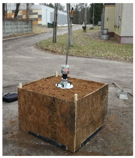 To assess the possibility of using peat as a model ground of the shooting station, a preliminary research program was planned and carried out. The program includes verification of the use of peat in the test stand and the validity of the selected research methods. For this purpose, a test stand was made in the form of a wooden box with a volume of 0.7 m3 in which previously weighed peat was placed. About 197.4 kg of peat was placed in the box, which allows to determine the bulk density at 282 kg/m3 (Figure 5).