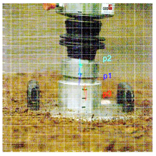 In the research schedule, it was assumed that the determination of the dynamic modulus of deformation Evd will be carried out with a lightweight deflectometer ZORN ZFG 2000 (Zorn Instruments GmbH & Co. KG, Hansestadt Stendal, Germany). During the tests, it turned out that the magnitude of the generated acceleration exceeds the measuring capacity of the accelerometer amounting to ±100 g, which corresponds to a displacement of 0.2–30 mm ± 0.02 mm. Therefore, a Photron high-speed camera was used to determine the course of displacement during the dynamic test. The image was recorded at a frequency of 6000 frames per second, but the analysis of the dynamics of this phenomenon indicates that 2000 frames per second is sufficient. The recordings from the camera were subjected to imaging analysis in order to determine the changes in the position of the measuring points during the test. During one study, three drops were performed. The analysis took into account three reference points (p0; p1; p2) marked on the device used (Figure 7).
