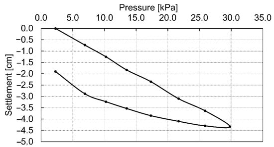 The results of the static tests, calculated using Equation (1), are shown in Table 2. Figure 8 presents the dependence of the soil settlement on the used loads. The shape of this graph suggests the linear soil response to the applied loads. In this case, in the calculation of the modules, the value of the Poisson’s ratio for peat , and the plate diameter were assumed.