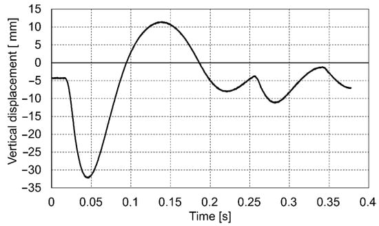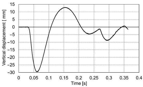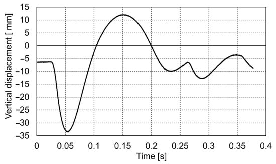 The course of the impact was recorded in the dynamic plate test with the use of a high-speed camera. On this basis, the values of the settlement of the loaded soil were determined for the entire impact phase. Below are presented the diagrams (Figure 9, Figure 10 and Figure 11) of displacement during three consecutive drops for the p0 point. Positive displacement values on the graphs are related to the detachment of the plate from the tested soil.