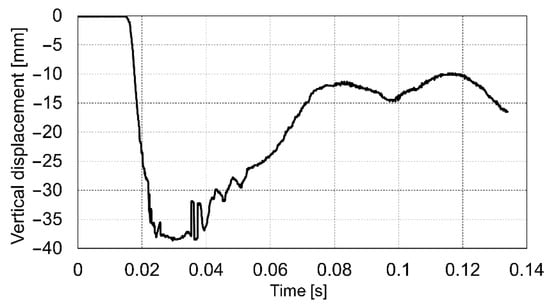 At the shooting place, four shots were fired. The first two shots were intended to pre-adjust the plate to the ground. The recoil pulses were 2153.84 and 2828.7 (Ns), respectively. The next two shots were carried out on a maximum pressure propelling charge (for mortar’s endurance tests) and the recoil pulse achieved 3704.07 (Ns). The maximum measured displacements of the base plate during shots No. 3 and 4 were 38.44 and 38.67 mm, respectively. The displacement of the base plate during the third shot is shown in Figure 14.