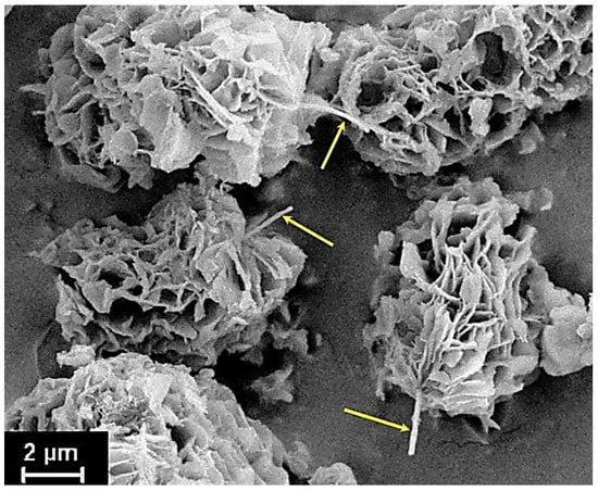 In order to obtain nanocomposite fibers, the calculated amount of VGCF nanofibers was loaded into the resulting PAA solution. The VGCFs were dispersed in the PAA solution using an overhead stirrer for 12 h. Then, the resulting suspension of VGCF nanoparticles in a PAA solution was subjected to chemical imidization by analogy with pure PAA. The resulting powders were dried for 2 h at 220 °C under vacuum. The concentrations of VGCF were equal to 0.5, 1, and 2 wt.%. Figure 1 shows the scanning micrograph of the synthesized polyimide R-BAPB powder particles with VGCF nanofibers included inside them.