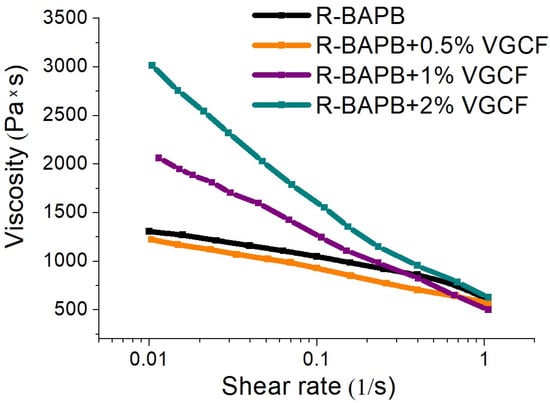 Dependence of viscosity on shear rate for R-BAPB modified with VGCF carbon nanoparticles.