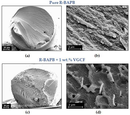 It is clearly shown that orientational stretching results in a significant increase in the strength and elastic modulus of these composite fibers, comparing to the undrawn ones, but at the same time it also noticeably reduces the plasticity of the fibers (strain at break). It is also worth noting that at high concentrations of the nanoparticles (2 wt.% VGCF) introduced into the polyimide matrix, both the strength and the elastic modulus also decrease, which is especially noticeable for the oriented samples. This is probably due to the fact that the nanoparticles in such high concentrations being in the field of mechanical forces begin to interfere both with each other and the polymer macromolecules to be oriented along the fiber axis and, thereby, reduce the efficiency of orientational drawing. We would like also to remind that a similar effect has already been described earlier when considering the results of WAXS. In addition, it should be taken into account that melts of R-BAPB polyimide with a high content of the fillers had a high viscosity (see Figure 2) and, as a consequence, the composite fibers obtained in the process of extrusion could have a higher degree of jet drawing. Thus, the fibers were already overdrawn upon further high-temperature orientational drawing up to DR = 4 and, as a result, had an increased number of microdefects, chain breaks, etc. As mentioned above, according to SEM data, the nanoparticles loaded into the polyimide have low adhesion to the polymer matrix and, hence, can be considered as numerous defects. Consequently, the higher the nanoparticles content in the composite fiber, the higher the concentration of such defects. This, in our opinion, explains the decrease in strength and elastic modulus.