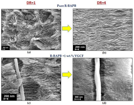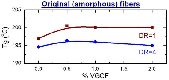 Analyzing the obtained DSC data, it was evidently revealed that the glass transition temperature (Tg) of the unoriented amorphous samples (DR = 1) is higher than the Tg of the fibers after orientation (Figure 11). Most likely, this is due to the fact that the oriented state of the polyimide macromolecules is nonequilibrium one and, as a consequence, when the temperature rises, such macromolecules tend to return to their original state as soon as possible. As for the unoriented fibers, the VGCF nanoparticles are found to be able to restrict the mobility of the polyimide macromolecules and to act as macroscopic cross-links, inhibiting the mobility of the macromolecules. As results, it leads to slight increase in Tg of the composite fibers comparing to the pure R-BAPB fiber (Figure 11 and Figure 12). Similar effect was already observed elsewhere [35].