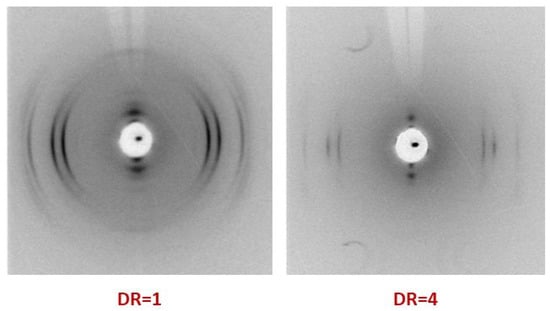 Based on the WAXS data presented in Figure 5, one can conclude that after additional thermal annealing, the fibers have a crystal structure typical of this polymer. Leaving the die of the extruder, the fiber already has a certain preferential orientation of macromolecules along its axis, which subsequently leads to the appearance of texture in the crystallized state. Therefore, in Figure 5 on the left side (DR = 1), instead of Debye rings, arches of the main crystal R-BAPB reflections are revealed. Moreover, after orientational drawing up to DR = 4, a noticeable narrowing of the arched reflections is observed, which indicates a significant improvement in the orientation of the polymer crystallites along the fiber axis.