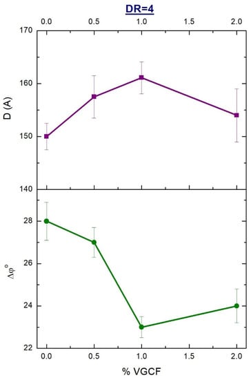 An effect of the loaded VGCF nanoparticles into the R-BAPB polymer matrix on the misorientation angle (Δφ°) along the axis of the unoriented (DR = 1) crystallized nanocomposite fiber is clearly demonstrated in Figure 6. It is well seen that a small amount of the nanofiller (0.5 wt.% VGCF) improves the alignment of the polyimide crystallites in the direction of extrusion. However, further increase in the nanofibers content gives an opposite result, leading to a rise of the misorientation degree. The reason of such structural changes at VGCF concentration >1 wt.% could be ascribed to the fact that the VGCF nanoparticles added in high amount cannot be effectively oriented being in the melt and passing through the die hole. Therefore, the polymer crystallites nucleated on them also are far from being perfectly oriented. Hopefully, the following orientational drawing at higher temperatures could help the polymer composition to better orientation of its components.
