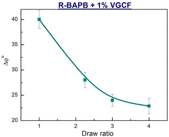 Taking into account the data mentioned above and the conclusions drawn on their basis, the dependences of the misorientation angle Δφ° on the draw ratio of the nanocomposite fibers with the content of 1 wt.% VGCF were obtained (Figure 8). An analysis of the plotted dependences showed that an increase in the degree of drawing of the samples up to DR = 4 makes a significant contribution to the improvement of the orientation of the R-BAPB crystallites. This fact is of particular importance, since it means that in the process of orientational drawing there is an effective alignment of the macromolecules in the direction of the fiber axis, rather than their slipping along to each other.