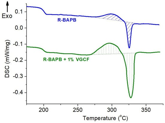 According to the data shown in Figure 9, the VGCF carbon nanoparticles introduced into the R-BAPB fibers have a nucleating ability. This effect manifests itself in the form of a decrease in the temperature of the onset of crystallization (in comparison with the fiber made of pure polyimide R-BAPB) and an increase in the degree of crystallinity, i.e., areas under the peaks of crystallization and melting. It was also found from isotherms obtained at 280 °C for the pure R-BAPB and composite fibers that the introduction of the carbon nanofibers significantly accelerates the crystallization of the unoriented (DR = 1) fibers based on R-BAPB polyimide: loading of only 1 wt.% VGCF reduces the crystallization time by a factor of 5. Therefore, it can be said with confidence that adding of the carbon nanofillers leads to an earlier onset and acceleration of the crystallization process of the polyimide matrix.