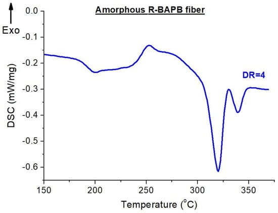 DSC thermogram of the amorphous polyimide R-BAPB fiber after orientation drawing (DR = 4).