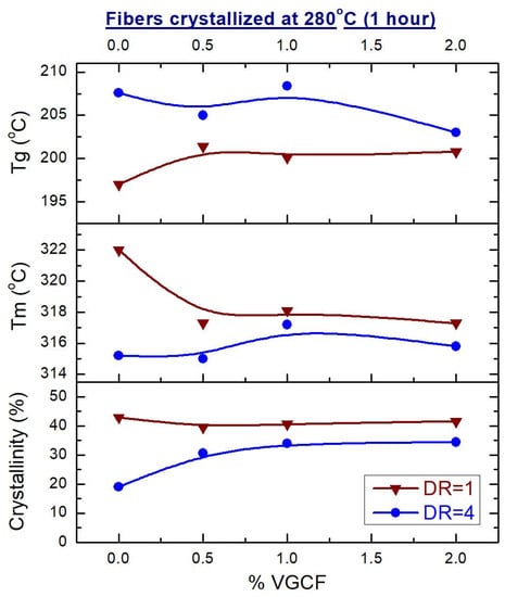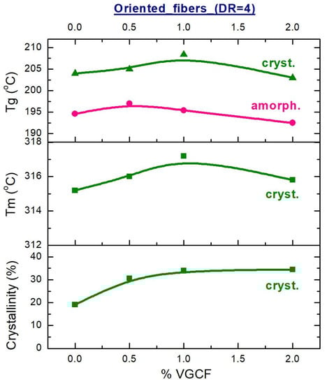 In the oriented state (DR = 4), the glass transition temperature (Tg) of the crystallized samples is higher than the Tg of the amorphous fibers by an average of 10 °C. Therefore, the mobility of the macromolecules in the crystallized samples is strongly inhibited. Nevertheless, the crystallite size first increases and then decreases depending on the content of the introduced nanofiller. But the degree of crystallinity remains unchanged. Therefore, it can be assumed that at a concentration of 1 wt.% VGCF, the polyimide matrix consists of large crystallites. With a further increase in the content of the nanoparticles, the crystallite size decreases, but the number of crystallites increases (since a larger number of the nucleating centers, such as nanoparticles, appears in the polymer), which ultimately gives the same volume fraction of the crystallized polymer.