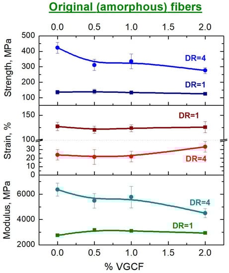 Figure 14 shows the concentration dependences of the mechanical characteristics (tensile strength, strain at break and Young’s modulus) of the amorphous composite fibers based on polyimide R-BAPB both before (DR = 1) and after orientational drawing (DR = 4).