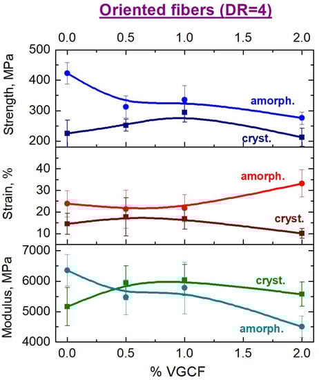 Comparative dependences of the mechanical properties on the concentration of the nanoparticles in the oriented (DR = 4) composite fibers in both amorphous and crystallized states are shown in Figure 15. It can be well seen from the presented data that a change in the fine structure of the oriented fibers based on R-BAPB during crystallization leads, ultimately, to a decrease in almost all mechanical characteristics. We assume, that the formed crystallites are weakly connected to each other by through chains and, thus, the number of the load-bearing macromolecules is too small to withstand the applied stress. It can be supposed that after the formation of the crystallites, the disordered regions of the polymer matrix consist mainly of the ends of macromolecules located at the boundaries of the crystalline regions. Nevertheless, as it was expected, one can observe the maximum strength characteristics at the concentration of 1 wt.% VGCF in the polyimide matrix, since this fiber demonstrated the best alignment of the crystallites along the fiber axis (see Figure 7).
