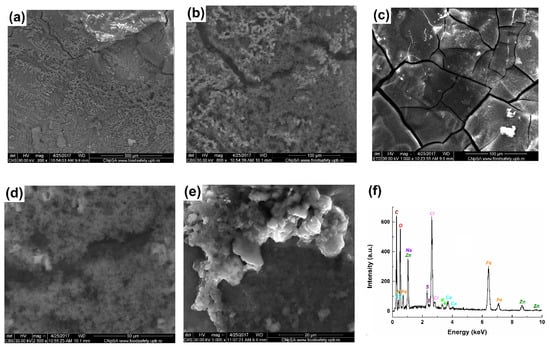 SEM micrographs of steel (sample 1) covered with corrosion products formed after exposure for 166 days in Fomtec (a–e); magnification from ×200 (a) to ×5000 (e); EDS spectrum showing elemental composition of corrosion products (f).