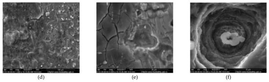 SEM micrographs (ETD images) of steel sample 1 (a–c) and steel sample 2 (d–f) after removing corrosion products formed after exposure 166 days in Fomtec; magnification from ×1000 (a,d) to ×10,000 (c,f).