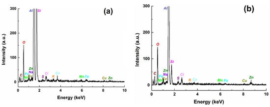 If the composition of the corrosion products (indicated in EDS spectra, Figure 5 and Table 3) is compared with the composition of Al alloy, the changes can be observed for all concentrations of the constituent elements. Thus, Al content decreased drastically from 77% to 35–40%, while silicon, which had a maximum of 13% in the alloy, had a variable concentration in the corrosion product—more than double the content (33%) after exposure to Fomtec and very low content (4%) after corrosion in Profoam. The contents of Cu, Fe and Mn decreased significantly. There are also elements such as oxygen (26–30%), carbon (21% for sample corroded in Profoam) and chlorine (around 1%) that were constituents of the corrosion products.