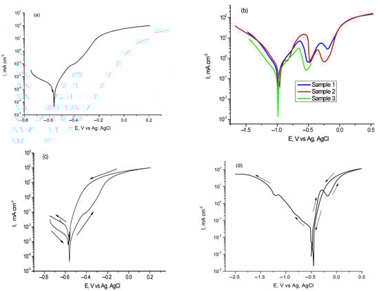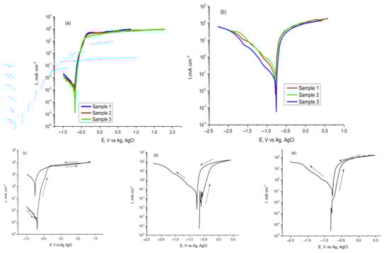 In Figure 9, the branches of polarization curves at the most negative potentials (left) correspond to the cathodic reduction of dissolved oxygen. The oxygen molecules existed in solution because no deaeration (not bubbling with argon or pure nitrogen) was performed. It is possible to have a certain amount of absorbed reactive atomic hydrogen produced by the humidity in the environment [44,45], as discussed in the Introduction.