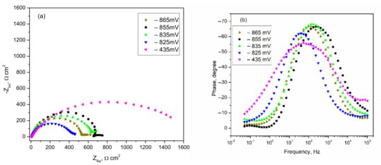 Figure 8 shows a series of electrochemical impedance spectra recorded for 42.2 k steel samples in Profoam foam concentrate. Starting from the OCP, which has the value −865 mV vs./AgCl, various EIS spectra for more and more anodic polarization up to overvoltage of 430 mV were performed. For each Nyquist curve in Figure 8a, we observed an imperfect depressed capacitive semicircle which has at its end (at low frequencies) a linear portion, a “tail,” which can be attributed to the formation of a film on the electrode surface. A horizontal line would indicate an unstable film, suggesting a layer of corrosion products that periodically come off or are soluble in the electrolyte (unstable passivation). At high anodic polarization, the semicircles tend to have a worm-like, twisted inward shape, meaning that the corrosion products formed are more strongly adsorbed. However, the main feature of semicircle diameter (i.e., polarization resistance Rp) is the existence of two trends of variation with anodic polarization: (i) at potentials between −865 and −835 mV a fluctuant value of the diameter (500–700 Ωcm2) is observed, proving an active corrosion; (ii) in the range of large polarization from −825 mV to −435 mV, the sudden growth of the diameter suggests a substantially diminished corrosion due to passivation. The phase angle–frequency dependence showed by Bode diagrams exhibits each time a single maximum phase angle. Almost constant value around −70° at low anodic polarization (including −835 mV) indicates strong barrier properties of the surface oxide as semiconductor corrosion products deposited on the steel’s surface. Recall that a maximum angle of –90° corresponds to an ideal electrical insulator. One might think that the film is always quite compact, but at the final high anodic polarizations of −825 and −435 mV, the maximum angle decreased gradually to −55°, which suggests less electric insulation, confirming an instable non-protecting layer.