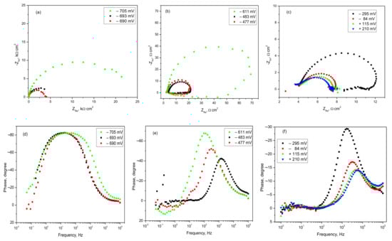 Nyquist spectra (a–c) and Bode phase angle spectra (d–f) for AlSiCuMg alloy in Profoam at various electrode potentials starting from −705 mV (OCP).
