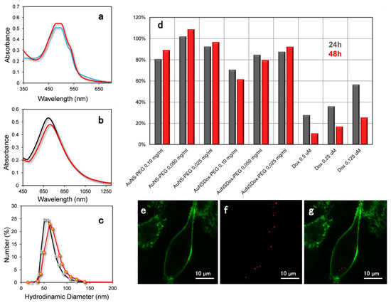 Gold nanostars were further capped with thiolated PEG and functionalized with doxorubicin. After incubation with the drug, the nanoparticles were precipitated by centrifugation and the supernatant was analyzed by UV–VIS absorption. The spectrum of the supernatant was compared with that of a doxorubicin water solution at the same concentration used for the loading on the AuNS. The spectra are reported in Figure 2a. The supernatant spectrum shows a slightly reduced doxorubicin absorption peak, and this confirms. This indicates the effective loading of Dox molecules on the AuNS. The doxorubicin uptake was estimated to be around 1.2% wdrug/wAuNS from the UV–VIS spectrum. The stability of the AuNS-Dox-PEG nanoparticles was investigated in PBS buffer, a good surrogate of the cellular medium. Nanoparticles UV–VIS absorption and hydrodynamic diameter in high salt buffer (red plots) did not show remarkable differences compared to the same values measured in Milli-Q water (black plots) (Figure 2b,c). This indicated that the PEG coating can efficiently shield the nanoparticles from the medium, inducing a high stability to the nanoformulation.