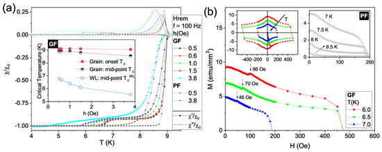 The inset in Figure 2a shows the dependence of , due to the grains, on h evaluated at the first drop in onset point and as it reaches half of its minimum value (mid-point). The weak-link critical temperature, , defined by the second drop in is also represented. The onset obtained for the various h differs only within experimental error, in agreement with the PF data, as the drive field amplitude is not large enough to influence the stronger intragrain shielding capacity. On the other hand, by comparing the mid-point critical temperatures for both grain and WL, a stronger variation with h is observed for the latter. This fact can be attributed to structural inhomogeneities in the groove, i.e., the presence of WLs for which the intergranular magnetic response is strongly affected by h, being consistent with the expected damage caused by the gallium ion beam, which is confined to such region.