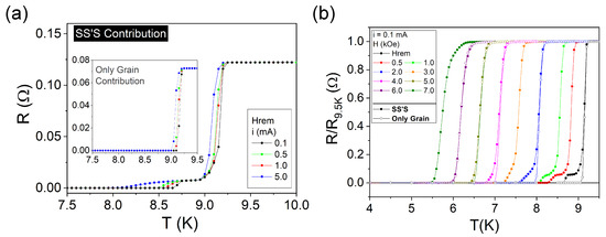 The evolution of the superconducting transition for the SS′S contribution with different applied fields at a fixed current i = 0.1 mA is shown in Figure 3b normalized by the resistance values at 9.5 K, , for each curve. The transition related to the grain contribution becomes wider and the onset decreases down to 6.50 K at H = 7 kOe. As the applied field increases and so does , it becomes difficult to differentiate between the first transition and the second one due to the groove. To visualize this trend, Figure 3b also presents the evolution for the grain only, i.e., between the electrodes 2 and 3, as shown in Figure 1b. At , the second transition is well defined for the SS′S data, and it does not appear for the grain, as expected. This difference progressively becomes more subtle until 6 kOe, when it is not possible to resolve any vestige of the second transition. It occurs due to the overall deterioration of superconductivity of each contribution which leads to similar critical temperatures at this DC applied field.