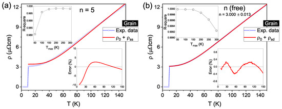(Color online) Temperature-dependent resistivity for the grain contribution. In panel (a), the red line is the fitting for in Equation (4) up to 150 K, whereas (b) shows the fitting for n as a free parameter for same equation. The upper and lower insets for both panels show the R-square coefficient versus the upper limit of temperature and the relative fit error versus temperature, respectively.