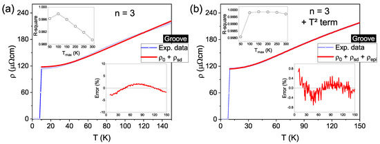(Color online) Resistivity versus temperature (up to 150 K) curves for the groove. The fitting depicted by the red curve in (a) represents the band scattering (), as described by Equation (4). In (b), the red curve represents the fitting considering an additional contribution given by Equation (5) in comparison to the fitting in (a). The lower inset in both panels represents the relative fit error and the upper insets shows the quality of the fit given by the R-square coefficient, which changes when the temperature upper limit is varied.