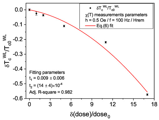 The evolution of the relative variation with the concentration of defects measured by the relative dose variation is presented in Figure 6. The first clear characteristic is the presence of the expected monotonous decrease of as the defect concentration is increased, reaching values as low as (3.5 ± 0.1) K. Furthermore, Equation (6) was fitted to the data only by replacing by the values of the respective doses used in the fabrication process. The model agrees reasonably well with the experimental data, despite the values of being collected via volume-average magnetic measurements, and not from resistivity. The overall agreement seems to validate the relationship assumed to exist between and . This not only corroborates the findings of [37], but also indicates that the model is a rather robust description of the underlying mechanism leading to the simultaneous occurrence of a variation in and the emergence of the quadratic-in-T resistive contribution in defect-bearing specimens. The relationship between superconductivity and normal state properties in our single WL Nb samples is then demonstrated to arise from the inclusion of defects, evidencing once again the milling procedure as the cause of the deterioration of superconducting properties.