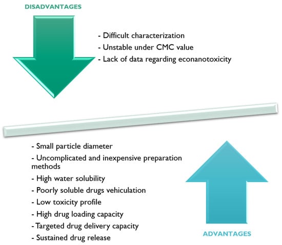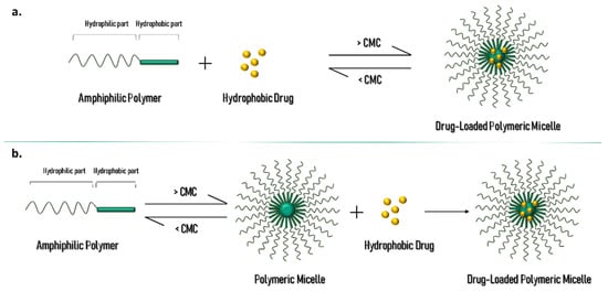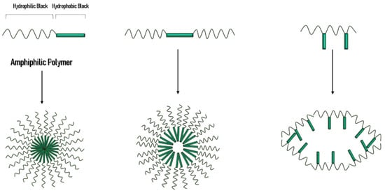 Micelles usually have a spherical morphology. However, depending on the copolymers selected, the self-assembled system can origin a worm-like or cylindrical micelle morphology, polymer vesicles, or polymersomes. The structure of the formed PM is related to the hydrophilic–lipophilic balance (HLB) of the copolymers and the solvent selected for micelle preparation [26,27].