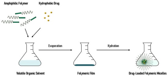 A volatile solvent is selected to dissolve both the copolymer and the drug. After the evaporation of the solvent, a polymeric drug containing matrix is formed. Subsequently, the matrix is heated and hot water is added, leading to micelle formation. This method is also designated as solution casting [31].