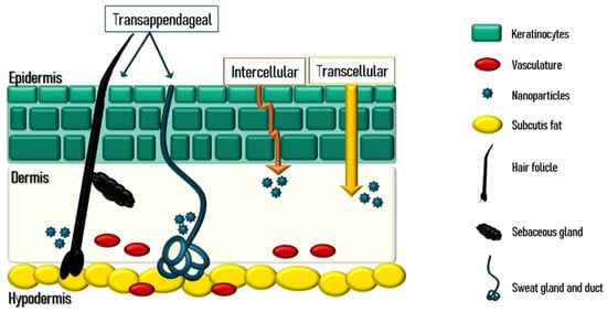 Transappendageal route, also known as the shunt route, occurs when a drug utilizes the appendageal elements of the skin to penetrate, such as the sweat glands, PSU, and pores. It was described as the pathway with the less significant contribution to the skin penetration, as the appendages only cover 0.1% the skin area. Despite of that fact, this is an important pathway of penetration for drugs with low permeation in the transcellular and the intercellular routes. Other opportunity regarding the shunt route is the targeted drug delivery, specifically for PSU and sweat glands affecting disorders. The application of targeted drug delivery in hair follicles and sebaceous glands can also improve the clinical efficacy of several topical treatments, as a smaller amount of drug is needed, reducing the potential local and systemic adverse effects. According to that, formulating drug carriers with targeted API delivery can improve the API’s safety profile, enhancing the patient compliance to the treatment as well [3,38].