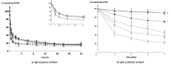 Remaining ATRA (%) in loaded PEG750-DPPE micelles (closed symbols) and 75% methanol/HBS solution (open symbols). Diamonds represent oxygen-filled environments, squares represent nitrogen-filled environments, and triangles represent ambient air (adapted from [20]). (a) light exposure ambient; (b) light protection ambient.