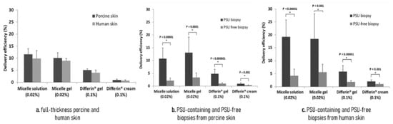 ADA-TPGS (<20 nm) were developed into a stable micelle solution and jellified in sodium carboxymethyl cellulose (NaCMC) to improve skin adhesion, accurate dosing, rheological properties, and to facilitate application. The micelle solution (0.02% ADA) and the micelle gel (0.02% ADA) were tested against marketed formulations, Differin® gel (0.1% ADA) and Differin® cream (0.1% ADA), to compare ADA skin delivery and ADA targeted PSU delivery in porcine and human skin. The DE was calculated according to the Equation (3) and results shown that ADA-TPGS is capable of PSU-targeted delivery, at a lower ADA content versus marketed formulations (Figure 7), which might provide less skin irritation and adverse effects, improving patient compliance. This study also verifies that TPGS-based micelles can serve as nanocarriers for poorly soluble drugs in formulations aimed at treatment of PSU related pathologies. Nevertheless, those promising results need further confirmation in clinical trial [42,57].