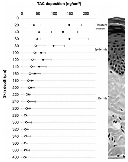 To compare the cutaneous bioavailability of TAC and its distribution profile along the skin layers, a stable formulation of 20 nm PMs containing 0.1% TAC, was compared with the one of the marketed formulations, Protopic® (0.1% w/w), and applied to porcine ears. TAC deposition from the micelle formulation after 12 h was significantly superior (Figure 8), especially in the SC, viable epidermis and superficial dermis, with similar deposition in the deeper layers as Protopic®, suggesting that TAC loaded MPEG-dihexPLA micelles can increase clinical efficacy in psoriasis topical treatment without increasing the risk of potential systemic adverse effects.